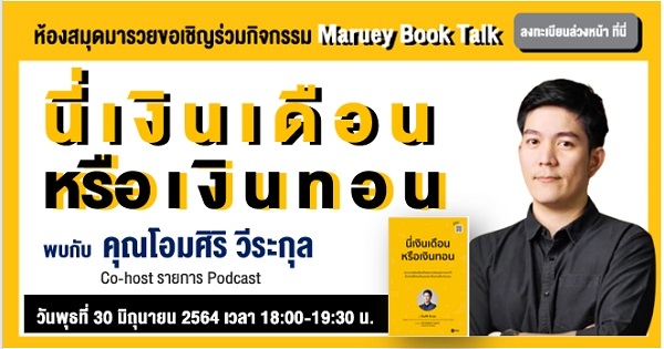 "นี่เงินเดือนหรือเงินทอน" คำพูดขำๆแบบนี้ บางทีอาจจะเห็นเป็นเรื่องตลก แต่ก็อาจจะไปตรงใจกับใครหลายคน... มาร่วมปรับรูปแบบการใช้ชีวิตให้เกิดความสมดุลด้าน "Money-Life-Balance" ในกิจกรรม Maruey Book Talk หนังสือเรื่อง "นี่เงินเดือนหรือเงินทอน" พบกับคุณโอมศิริ วีระกุล Co-Host รายการ Padcast "The Money Case by the Money Coach" และเป็นผู้แต่งหนังสือเล่มนี้