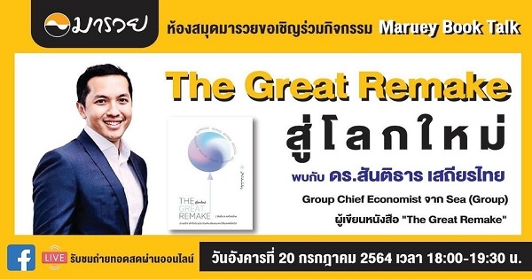 มาร่วมสำรวจปรากฏการณ์ดิจิทัลดิสรัปชั่นในทุกระดับ และการปรับตัวเข้าสู่ "โลกหลังโควิด" พบกันในกิจกรรม Maruey Book Talk หนังสือ "The Great Remake สู่โลกใหม่" พบกับ ดร. สันติธาร เสถียรไทย Group Chief Economist จาก Sea (Group) และผู้เขียนหนังสือ "The Great Remake สู่โลกใหม่"